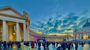Su columnata abraza a los peregrinos mientras la cúpula de Miguel Ángel domina el horizonte del Vaticano.